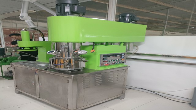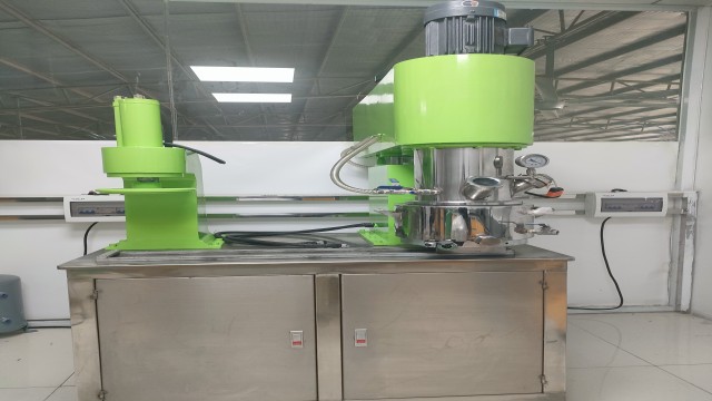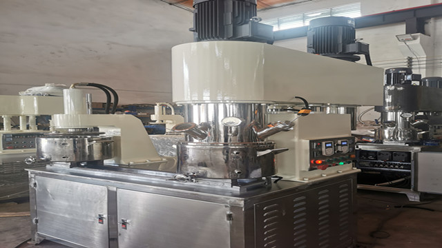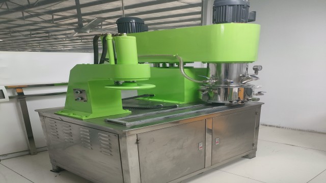 通过变频器启动行星架低速浆轴及高速分散轴,从低速调到高速进行搅拌,根据生产工艺,可从各管口加入各种材料,适时启动真空泵进行真空下工作,停止工作时应从高速调到低速,后停止转动,打开真空阀放空才能升降横梁,拉出料缸才能进行下一轮工作。